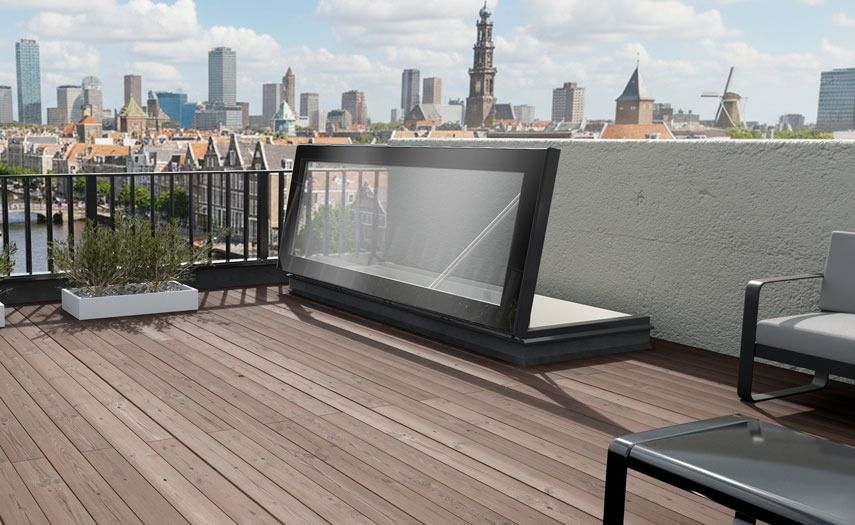 The combination of the glass roof hatch with a sleek aluminium fixed staircase creates a safe and modern total solution. In the largest model (clear opening 1000 × 3000 mm), large items such as roof terrace chairs, solar panels and roof installations can easily be transported to the roof.